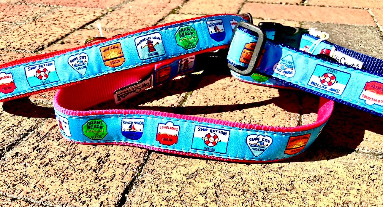 Show your love for our Island! LBI Beach Badge Collar with Gold D ring. Available with Pink, Blue, Red or Lime Green Background. Matching 6ft Leash also available.